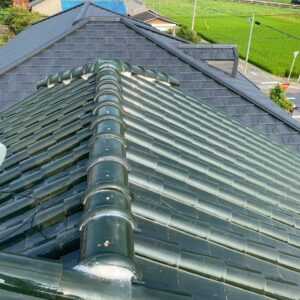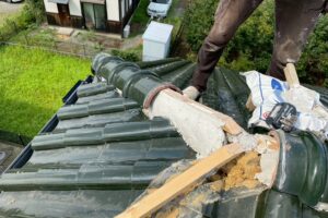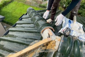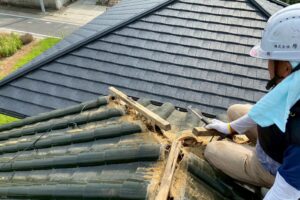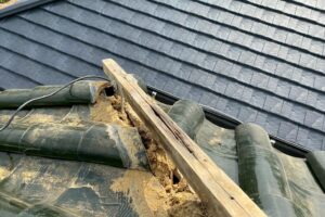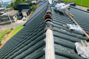 S瓦棟交換工事 2026/01/22 Before After 施工写真 施工内容 項目① 30年以上前のS瓦。垂木が腐り棟瓦が固定されていない状態でした。垂木を新しく変えて漆喰と土、防水剤を含んだ材料で修繕工事しました。